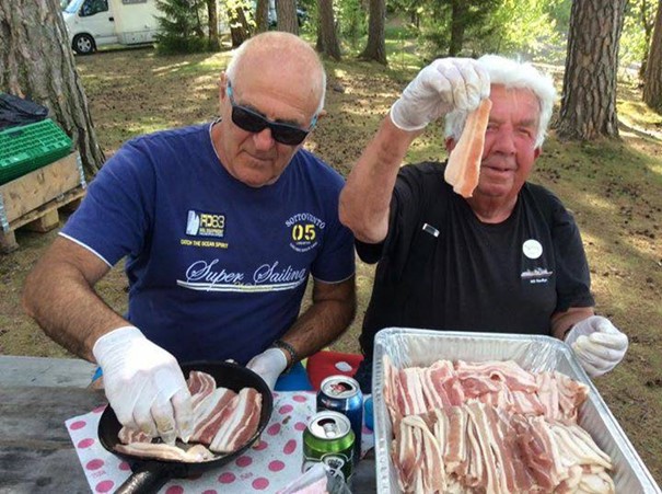 Lørdag stod som vanlig i matlagingens tegn. Steking av flesk på bålet, koking av poteter og kålstuing på ved-ovnene. Og presis klokka 17 startet servering av mat til nesten 300 personer.