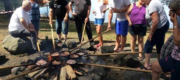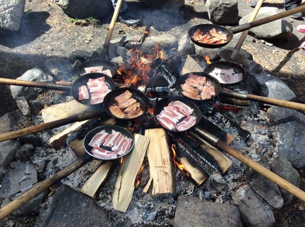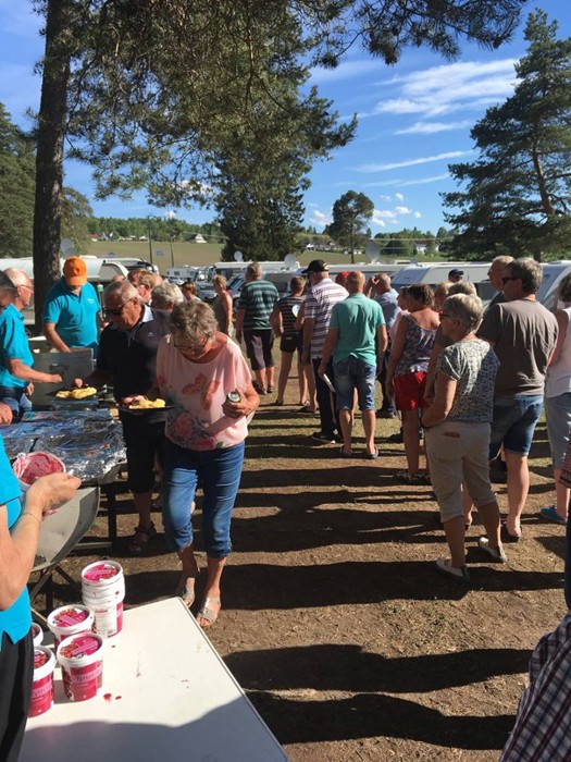 Lørdag stod som vanlig i matlagingens tegn. Steking av flesk på bålet, koking av poteter og kålstuing på ved-ovnene. Og presis klokka 17 startet servering av mat til nesten 300 personer.